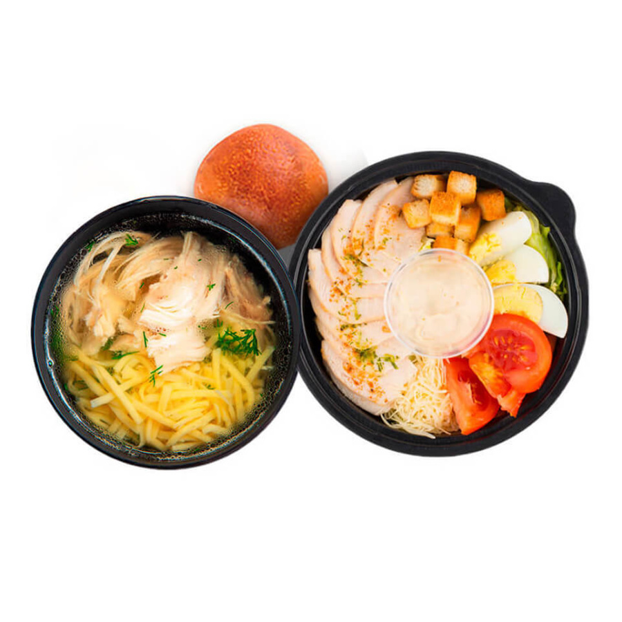 Цезарь с курицей Салат Помидор Яйцо Филе куриное фри Сыр пармезан Сухарики Соус Булочка Булочка свежеиспеченная Лапша домашняя