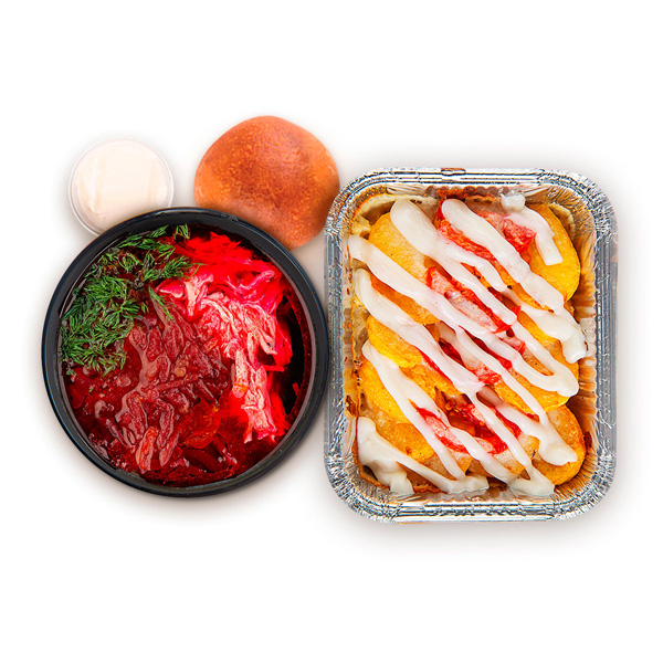 Борщ горячий Бульон куриный натуральный Филе куриное Картофель Свекла Морковь Лук Зелень Продукт Сметанный Гратен Фирменный Картофель Куриное филе фри Цветная капуста Помидор Продукт Российский Продукт Моцарелла Соус Альфредо Сметана Продукт сметанный Булочка Булочка свежеиспеченная
