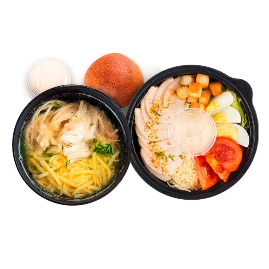 Цезарь с курицей Салат Помидор Яйцо Филе куриное фри Сыр пармезан Сухарики Соус Булочка Булочка свежеиспеченная Лапша домашняя